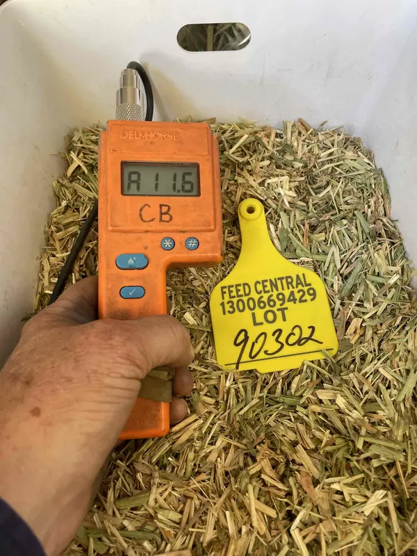 Barley hay in 8 string 8x4x3 bales stacked in a large open shed with good access and loading facilities. Cut with mower conditioner and cured in good conditions. Average moisture of 11.6%. Soft in texture. Some dust on exterior of bales from transport paddock to shed. Approx 50% green leaf and stems