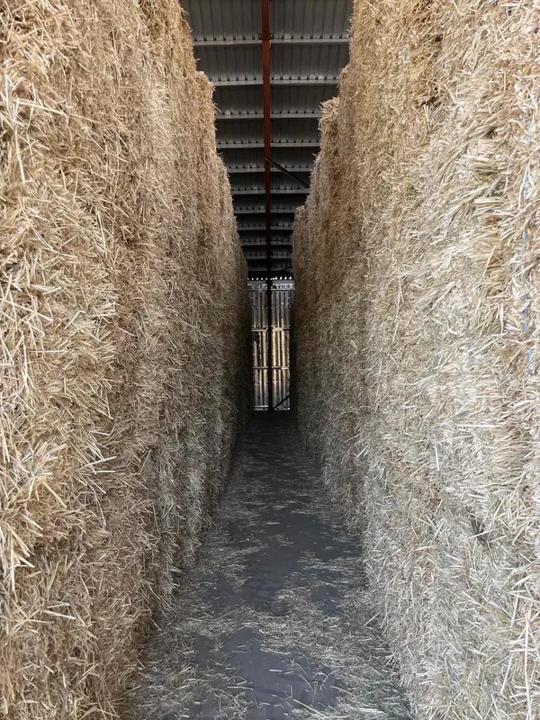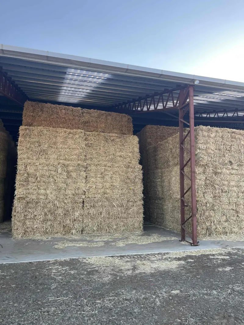 Great line of equine quality beardless cereal hay stored on concrete floor shed. Average moisture 13.7%