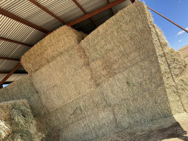 Barley lucerne blend hay in 8x4x3 bales. Approx 10% lucerne. Cut at milky dough. Cured in good conditions and raked 1. Stack stacked in safe shed with all weather access. Grower to do delivery. Even establishment of lucerne through paddock.