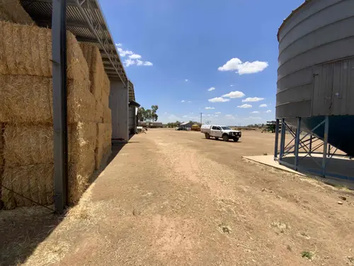 Narromine, NSWWheaten header tailing straw in 8 string 8x4x3 bales stacked in two sheds and under a well tarped stacked. Bale two days behind header. Small amount of canola straw in some bales. Straw clean and bright in colour with average moisture 12.4%. Grower wanting to do own deliveries.