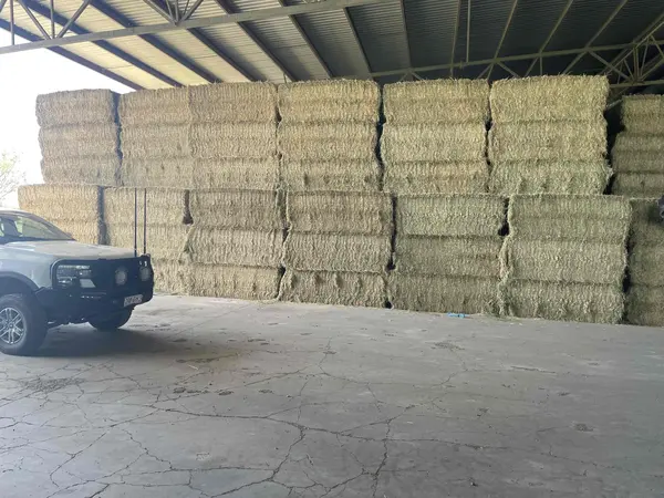 Dryland lucerne hay 2nd cut. Cut with mower conditioner at mid flowering. Cured in hot dry conditions with 1 raking. Baled with assistance of steamer. Average moisture of 12.8%. Clean leaf and stems with good colour. Fine stems, brittle with good leaf in bales. Stacked in a large shed with good all weather access.