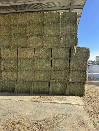 Wyuna East, VICNice line of leafy Second Cut Lucerne Hay. Cut pre to early flowering. Average moisture reading of 14.9%. Stored in a floor lined shed.