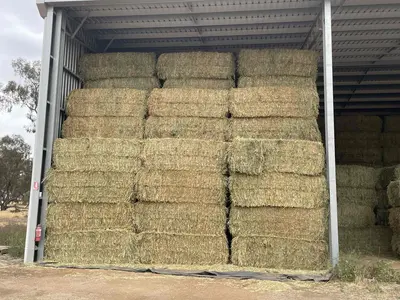 Quality oaten hay inn8x4x3 bales well protected in a new three sided shed. Cut at early milky dough stage and cured over 19 days. Has retained very good colour and texture. Average moisture of 12.6%