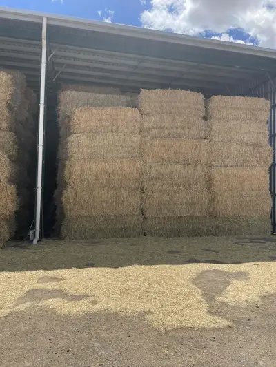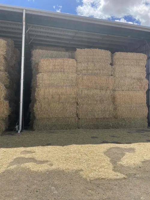 8x4x3 Oaten hay. Cut with mower conditioner, cured for 3 weeks, raked once before baling. Varying percentage of rye throughout. Stored in shed with good all weather access. Dust on exterior of some of the bales. Average moisture 13.3%
