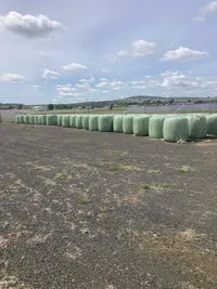 Line of Rhodes Grass silage in 4x4 round bales, net wrapped & wrapped in plastic. Cut with a mower conditioner with heads/pods formed. Raked once and cured over 3 days. Silage has good colour and aroma for species. Bales stacked on a gravel surface in a well-draining area.