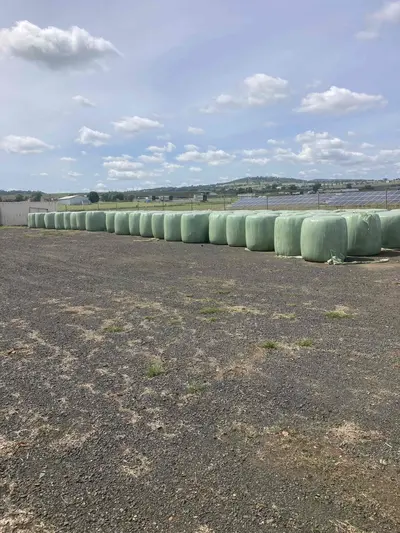 Charlton, QLDLine of Rhodes Grass silage in 4x4 round bales, net wrapped & wrapped in plastic. Cut with a mower conditioner with heads/pods formed. Raked once and cured over 3 days. Silage has good colour and aroma for species. Bales stacked on a gravel surface in a well-draining area.