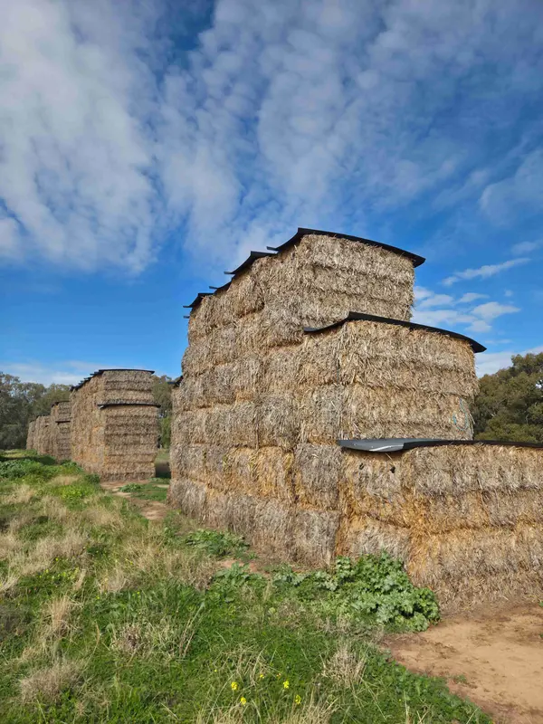 2024 Sudan grass hay. Good colour. Good sound 8 string bales stacked outside under haycaps on formed up pad to drain water away. Average Moisture 11.9%