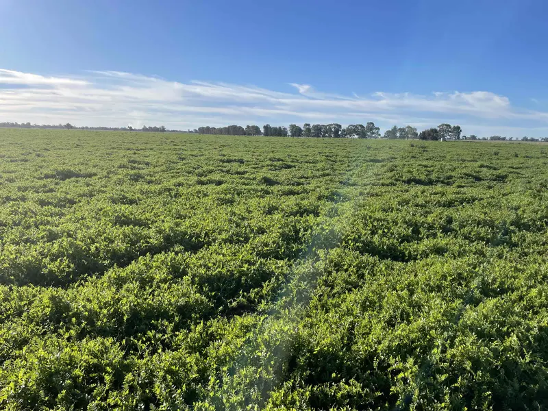 Crop looking healthy at time of paddock inspection. Small amount of milk thistle through crop. Didn’t roll behind planting so possible bust in bales. Planted at 25kg ha with 80kg MAP at planting. Has had one spray for grass control. No fungicide at time of inspection. Vetch hay in 8x4x3 bales. Cut with full pods evident. Cured in Hot dry conditions over 18 days with two rakings. Has retained reasonable colour. Stems brittle with good leaf content. Average moisture of12.1%. Stacked in a fully enclosed shed.