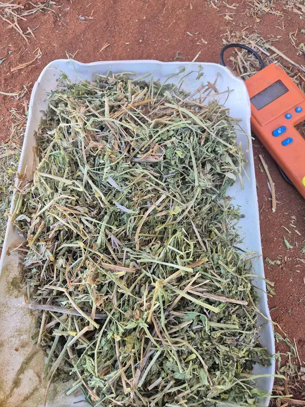 2025 vecth hay has a nice green colour and good leaf retention dose contain a small amount of last year's wheat straw visible apart from that it is weed free and very good hay