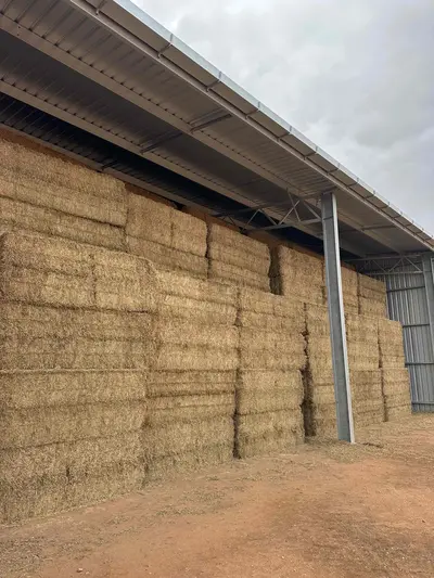 Vetch hay baled on the 12th of October 2025. Bales weighing 725kg. Moisture mostly ranging from 11-13%. No high readings. Excellent green colour and soft texture. Sweet fresh hay aroma. Leaf retention also is excellent. Some leaves may become detached when disturbed but not all. No weeds observed in bales. Bales are evenly shaped and stacked. Accessible from the road easily and is stored in a good shed with good elevation and drainage.