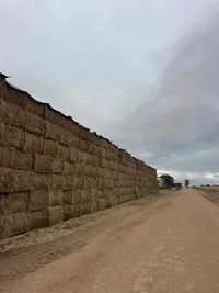Vetch hay baled on 20th October 2025. Bales weigh about 677kg. Ideal curing conditions. Bales are stacked outside with hay caps. Moisture readings were mostly 10-13%. 4 bales read higher than 18% including one reading 39%. Good green colour despite being stacked outside. Leaf retention is also good with leaves only becoming detached when disturbed. Fresh sweet hay aroma. Road is easily accessible for trucks.