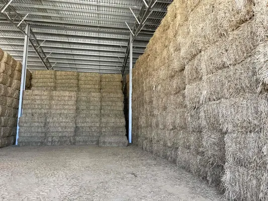 Wheaten hay in 8 string 8x4x3 bales stacked 5 high in closed shed with all weather access. Hay cut with mower conditioner at full flower with possible milky dough seed. Cured in good conditions with over 50% green leaf and stems. Average moisture of 14.4%