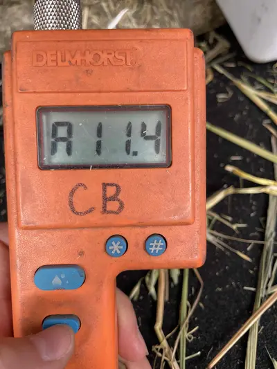 8x4x3 wheaten awned. Various percentages of rye throughout. 7mm of rain while curing. Cut with mower conditioner. Raked once before baling. Average moisture 11.4. Good all weather access.