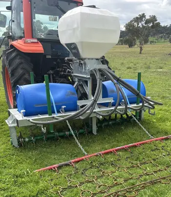2024 Agrifarm AV300 Heavy Duty GAL Aerator DOYLE SSB400 Air Seeder and Spreader Bar Redback Plain Chain Harrows Good Solid Aerator unit in Excellent Condition having only competed roughly 150Ha of Aeration and over seeding since new. AGRIFARM AV300 GAL Hot dip galvanised frame 3.0m working width 125x125x6mm RHS frame 70mm UCF bearings 75mm solid shaft 7-degree twisted cast tines Heavy-duty braced headstock - with Air Seeder mount Rear clevis drawbar Parking legs Hot dip galvanised Australian designed and built DOYLE SSB400 Air Seed Box 400 litre poly bin Single rotor metering for all seeds from Clover to Faba beans including multi-specie mixes. Easy, accurate calibration Electrically driven air blower motor -12V, 250w Ground Speed Independent Electric drive seed metering with - step-less speed adjustment - 12V, 200w industrial worm drive motor - In cab control box with On/Off, speed adjustment control switch and seed meter RPM readout Stainless/HDPE metering rotor with ~10-300kg per hour output HDPE seed meter rotor with tool-less half rate seed gate 8 x seed spreader plate with 32mm air seeder hoses Hot dip galvanising frame for longevity Australian designed and built