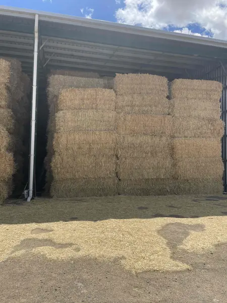 8x4x3 wheaten hay. Cut using mower conditioner cured for 3 weeks and raked once before baling. Average moisture 11.1%. Stored in shed with good all weather access. Crop cut due to dry seasonal conditions.