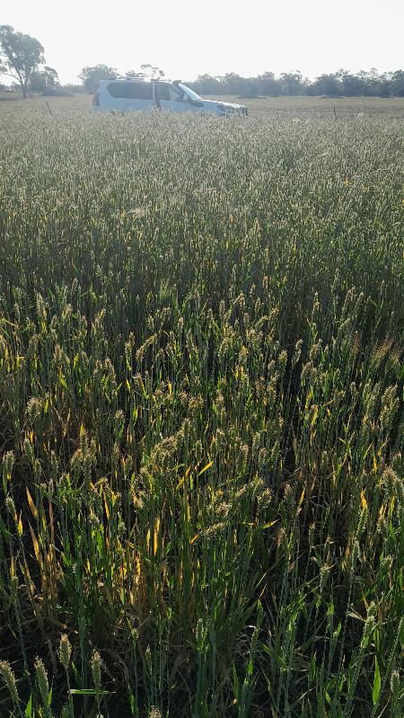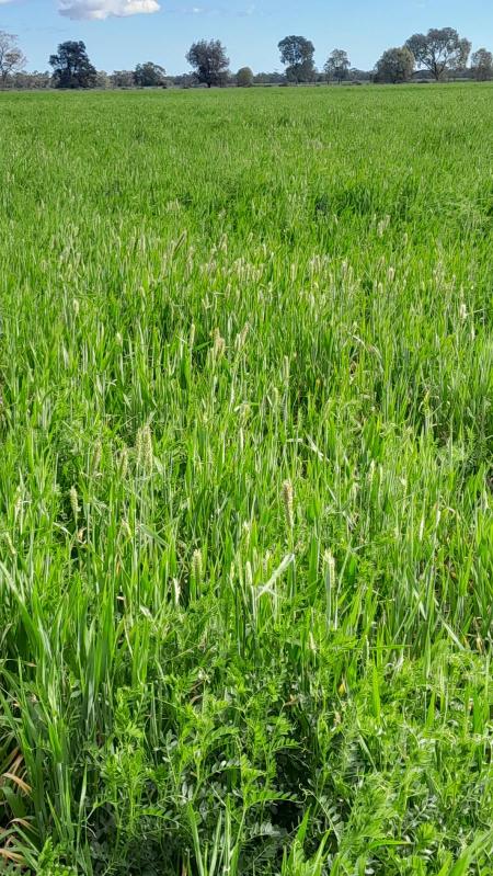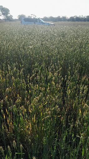 Moby barley with some vetch possible. Baled into 8x4x3 bales. Cured in 12 days with two seperate rain events with remainder hot dry conditions. Raked once. Colour golden. Average moisture of 12.9%. Normal to soft in texture.