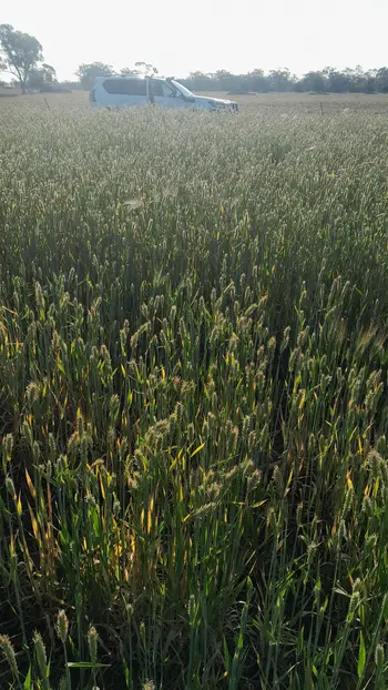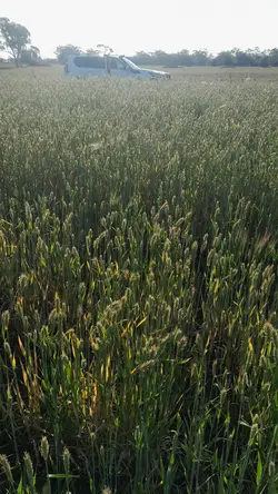 Moby barley with some vetch possible. Baled into 8x4x3 bales. Cured in 12 days with two seperate rain events with remainder hot dry conditions. Raked once. Colour golden. Average moisture of 12.9%. Normal to soft in texture.