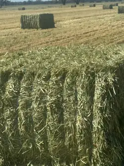Wheaten hay in 8 string 8x4x3 bales stacked in large new sheds with good access. Cut with mower conditioner at early milky dough stage. Large yielding crop not raked during an ideal curing period if 14 days. Well stacked 10 high in shed.