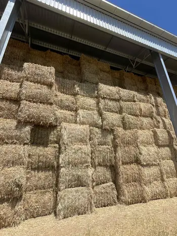 Wheaten header tailing straw in 8 string 8x4x3 bales stacked in an open shed 9 high with good access. Good sound bales. Clean bright straw with average moistures of 12.8%. Dry in texture.