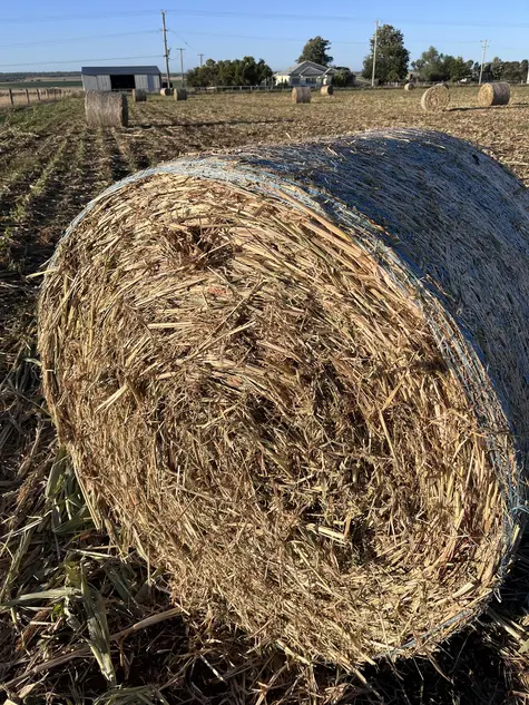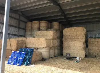 Lovely line of sweet Moby Barley hay, cut at heads emerged with some milky dough noted and perfect baling conditions. Average moisture of 16.5% This hay has good colour and very nice aroma. Stored in a good 4 sided shed on concrete flooring.