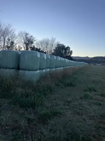 Lucerne Silage with some Barley varying throughout bales. Average weight of 400kgper bale stacked on earth/paddock surface. Cut young with flowers, possible heads/pods formed. Raked twice and cured over 2 days in good conditions. Normal stem thickness, aroma and colour for species. Net and plastic wrap