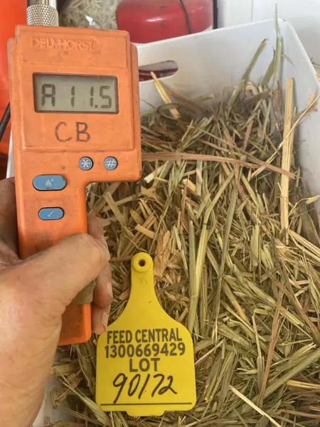 Oaten hay in 8x4x3 bales. Cut at flowering with possibility of some milky dough grain. Cut with mower conditioner. Received 2 rain events during the curing period. Has only stained a minor amount of the hay. Dust evident in core sample and small amount of residual cereal straw. Average moisture of 11.5% with a tight range. Normal to soft in texture.