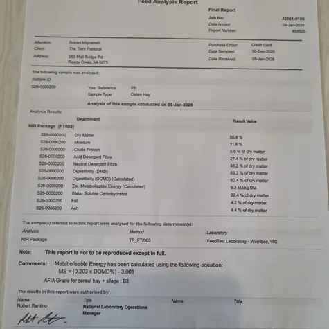 8x4x3 1300 bales available average weight 620kg, 750 bales stacked and hay capped and 550 bales shedded, feed test available