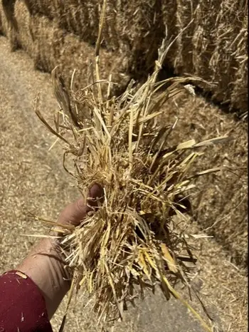 Barley header tailings in 8x4x3 bales. Grain harvested by Class header. 500kg bales stacked in shed. Baled directly behind header. Good colour.