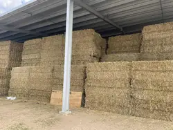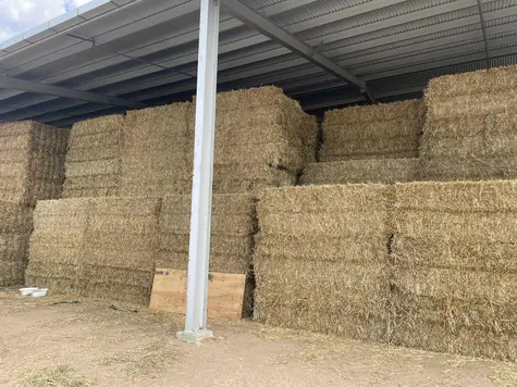 Winteroo oats in good secure shed with good all weather access on plastic. Cut in full flower with milky dough possible. Cured in 28 days with 40 mm rain on windrow 6 moisture readings over 18% out of 42. Silac was used. Some yellow stems. Normal to soft texture.