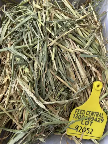 Large square bales oaten/ vetch hay. Oats definitely look the dominant species in the bale but when you pull it apart you can see the vetch leaf in among it. 65% oats at a guess. Good leaf/ no rain. Good colour and aroma. Stored in lined floor shed. Average moisture 13.3%.