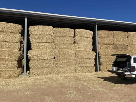 700 bales of oaten hay prepared in cool conditions slowing the process, good well baled hay averaging 12.9% moisture content & stored on plastic in an excellent shed
