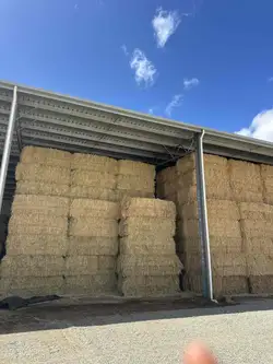 2025 Barley hay baled on the 21st October. Average bale weight is 635kg. All in the shed. 6 string 8x4x3 bales. Average moisture was 11.6%. Lowest was 10% and highest 13.3%. No high readings. Moisture readings mostly around 11%. Soft in texture. Great leaf and head retention. Good green colour. Not much sunbleaching. Sweet and fresh hay aroma. Great shed and good access to the road for trucks.